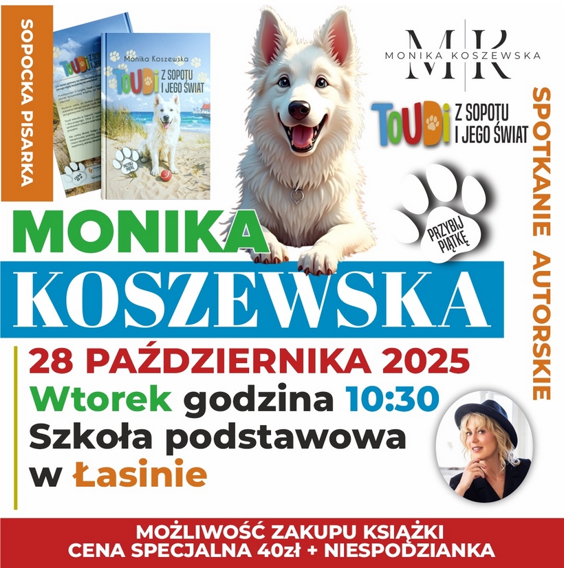 Informujemy, że uczniów Szkoły Podstawowej w Łasinie czeka miłe spotkanie edukacyjne. W ramach profilaktyki uzależnień szkołę odwiedzi znana sopocka pisarka - Monika Koszewska. Spotkanie autorskie promować będzie książkę "Toudi z Sopotu i jego świat", która w przystępny sposób przybliża dzieciom i młodzieży różnorodną tematykę oscylującą wokół dobroci dla zwierząt i ludzi.
